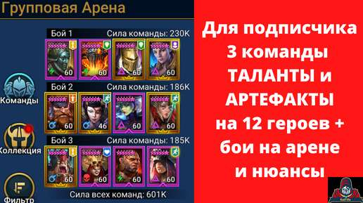 Арена 3х3 для подписчика. ТАЛАНТЫ и артефакты на 12 героев + бои. Рейд обзор команд Raid