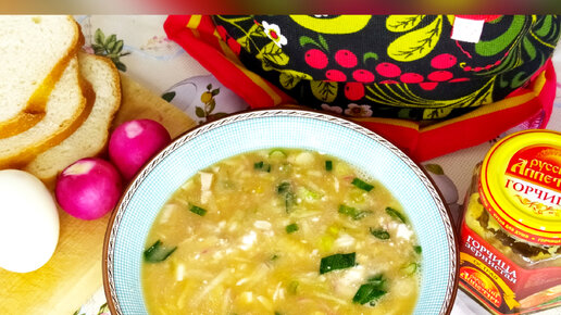 Окрошка на квасе с варёным мясом.