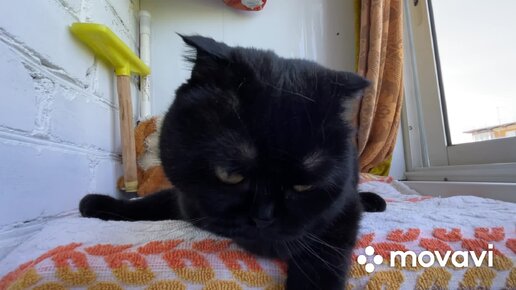 Кот Вася чёрный отдыхает на балконе с видом на каштан