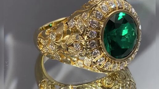 Перстень печатка из желтого золота с крупным изумрудом и бриллиантами
