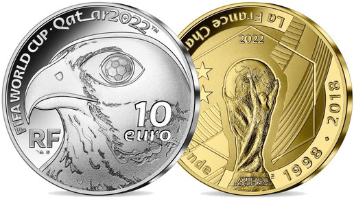 Монеты 10 и 50 евро Франции ЧМ по футболу в Катаре. Выпуск 2022 года.