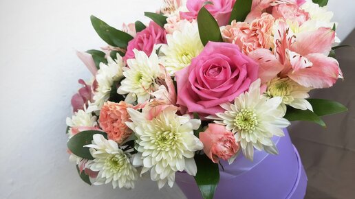 Красивый букет цветов из роз Аква (Aqua), хризантем и орхидеи в шляпной коробке. Цветы в шляпной коробке от магазина цветов Букетыроз