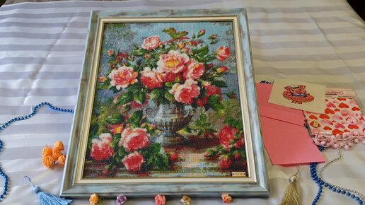Обзор оформленной работы "Розы в серебряной вазе" и подготовка к сборке игольницы