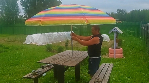 Мой сосед купил пляжный зонтик и приспособил его к улечному столу. Самоделкой остались довольны.
