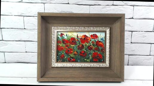 Маленькая картина маслом Пейзаж Поле с маками 10 на 15 см