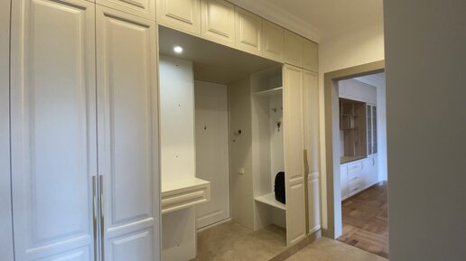 Интерьер прихожей зоны в Сталинском доме. Красивые высокие шкафы и длинные золотые ручки