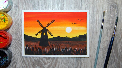Как нарисовать закат гуашью. Рисуем мельницу