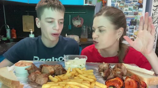 МУКБАНГ ШАШЛЫК_КАРТОФЕЛЬ ФРИ_ОВОЩИ НА МАНГАЛЕ_МАРИНОВАННЫЙ ЛУК