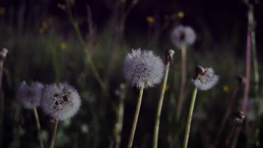ЗВУКИ НОЧИ, полное погружение в шум природы, сверчки, жужжание насекомых. Поле рядом с лесом, одуванчики в лучах фонаря, луговые травы.