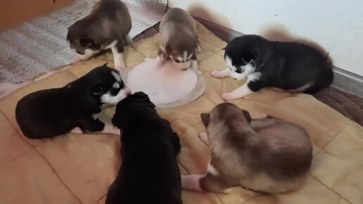 Налетели на КЕФИР. Кто самый голодный ? Щенки Хаски 18 дней