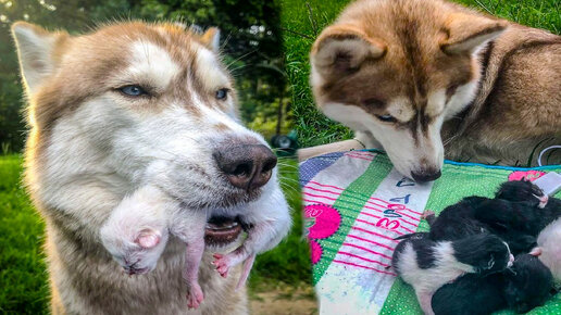 Умная хаски нашла в лесу коробку с котятами и стала о них заботиться