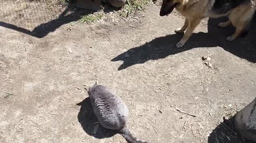 Кот пришёл в гости к немецкой овчарке. Она не знает, как реагировать на такую наглость