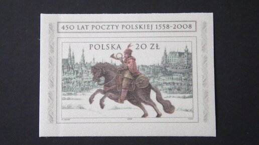 Необычный почтовый блок Польши на шелке - 450 лет почте Польши - 19.12.2008 года