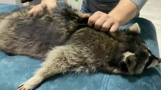 Реакция енота на первого хозяина. Сделали массаж еноту