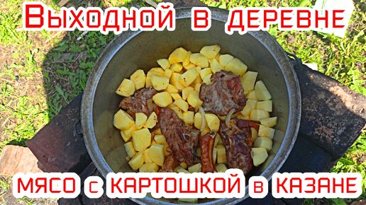 Выходной в деревне,Готовим мясо с картошкой, в казана на костре.