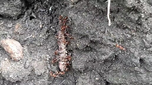 Муравьи тащат по вертикальной стене добычу - гусеницу.