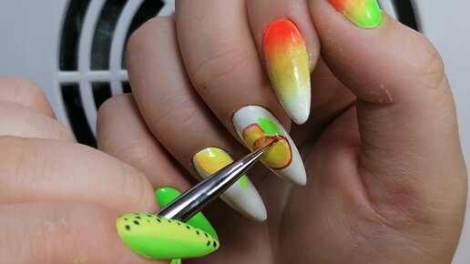 Наращивание ногтей себе на правой руке яркий летний дизайн градиент острый миндаль