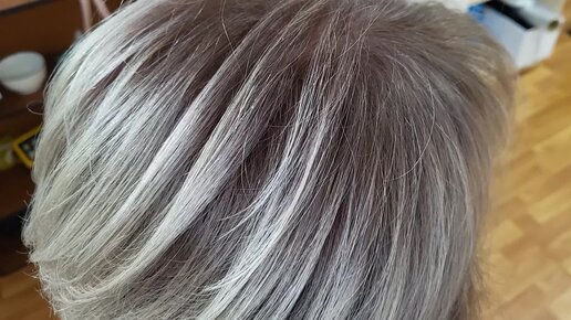 Окрашивание седых волос.Растяжка цвета.Пепельный блонд.