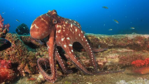 Осьминог демонстрирует свои навыки, а также охотится вместе с другими рыбами
