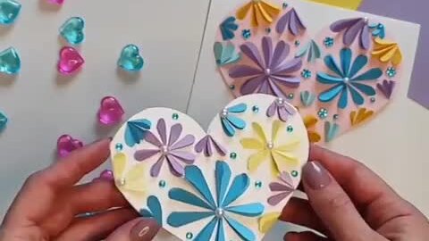 Сердечки вырезаем из согнутой пополам бумаги.В согнутом виде приклеиваем сердечки на основу.