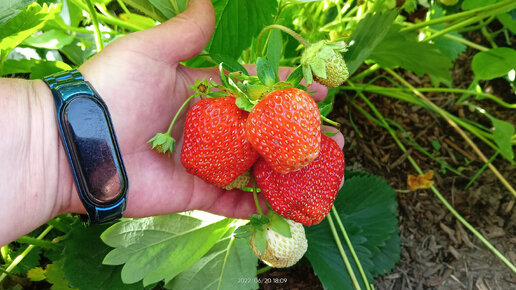 Первый сбор ягод клубники (садовой земляники).