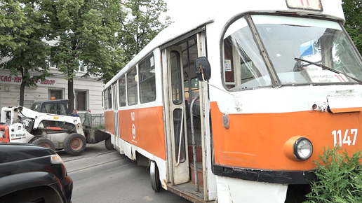 В Ульяновске трамвай сошёл с рельсов и врезался в бордюр. От столкновения сорвало пантограф