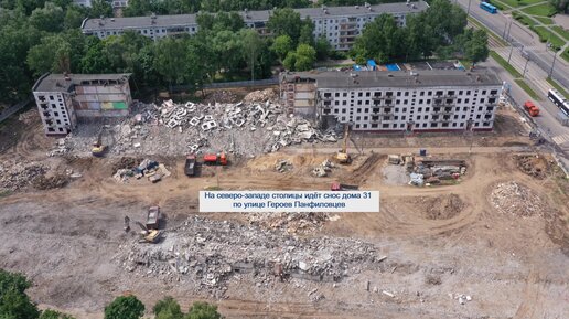 Вид с квадрокоптера на снос дома по реновации в районе Северное Тушино