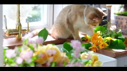 Любимый котенька играет с цветами