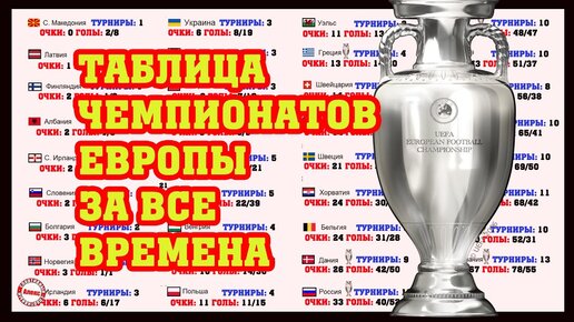 Общая таблица чемпионатов Европы по футболу за все времена. Англии до Италии, как до Москвы пешком.