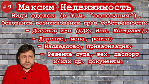Максим Недвижимость: Виды Сделок и Основания возникновения прав собственности ! Необходим профессионал? Звоните! Опыт, интеллект, 3 в/о.