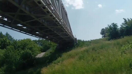 Пекинес Гуффи пьёт из речки под железнодорожным мостом