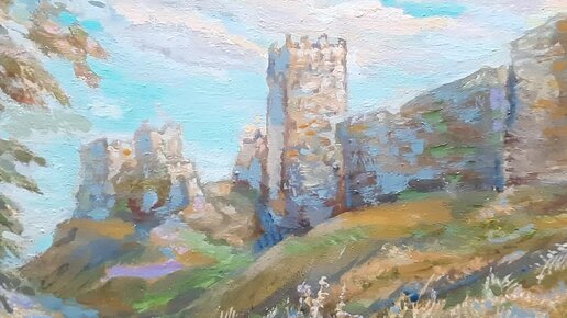 "Генуэзскаякрепость" крымский пейзаж из серии "крымские зарисовки" х/м, 26х34, 2021.Картина с "Голубой выставки" Н. Журавлёвой