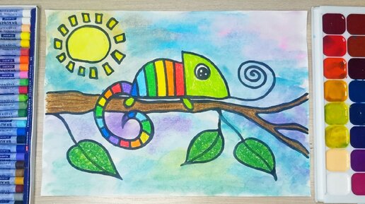 Хамелеон цвета радуги. Легкий рисунок масляной пастелью и акварелью