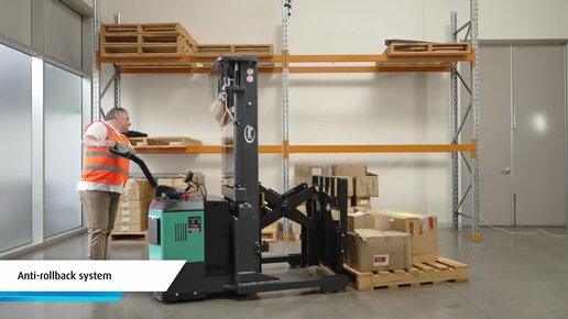 Пример работы электрического штабелера с выдвижными вилами (пантографом) для обработки второго ряда в фуре или на стеллажах на складе