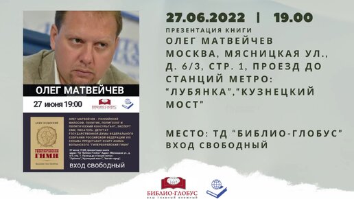 27 июня в 19:00 Олег Матвейчев в “Библио-Глобусе” / Презентация книги