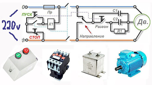 Как подключить трехфазный электродвигатель к однофазной сети 220 вольт, схема, описание работа, + формулы для расчета конденсаторов