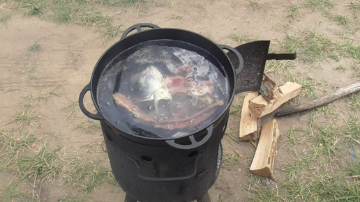 Уха или Рыбный суп из горбушы в казане на костре