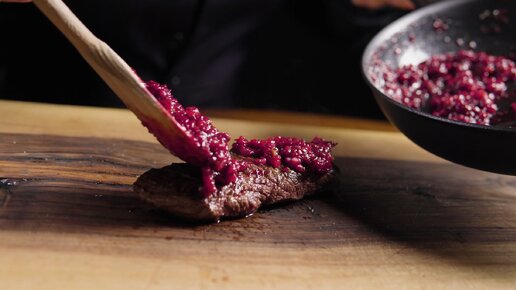 Стейк с пряным брусничным соусом.