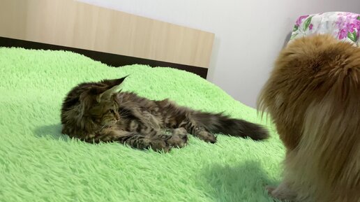 Сёма и Сабрина играют на кровати с мячиком