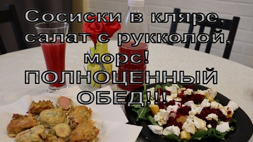 Полноценный обед. Сосиски вкляре. Салат с рукколой. Морс