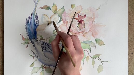 Как нарисовать Пион и Синюю Птицу акварелью в стиле иллюстрации.
