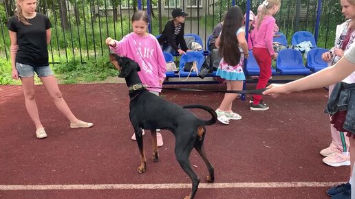 Дети дрессируют собаку. Дрессировка добермана. Юный кинолог