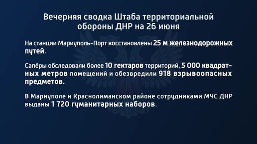 Вечерняя сводка штаба территориальной обороны ДНР на 26 июня 2022 года
