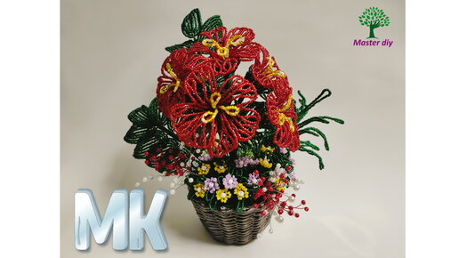 Ажурные цветы из бисера Композиция в плетеной корзинке из бумажной лозы Мастер класс\Master diy