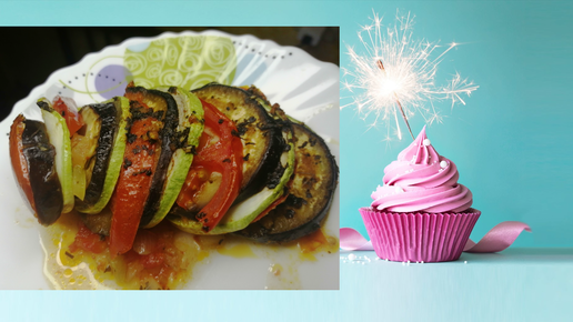 Рататуй. Овощи. Овощное блюдо. Летний вкус. Кабачки и баклажаны кружочками