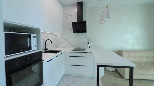 Современная п-образная белая кухня без плинтуса