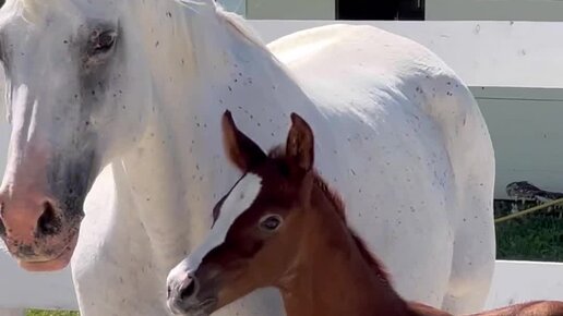 Трехдневный жеребенок впервые выходит с мамой на улицу