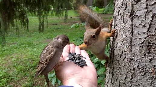 БЕЛОЧКА И ВОРОБЕЙ НА ЛАДОНИ!!!