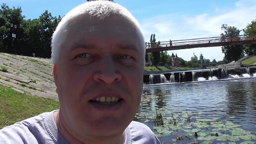 Геннадий Горин снимает видео про водопад под мостом, река Орлик. Подвесной мост, город Орёл