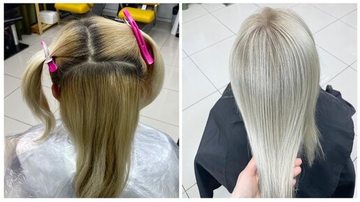 Пепельный блонд без желтизны с глубоким корнем. Осветление краской ранее окрашенных волос. Окрашивание суперблондом ранее окрашенных волос